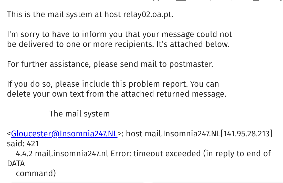 If you are an advocate at Portugal then please beware that incompatibilities between email servers at Portugal and at the Netherlands might prevent you from successfully notifying me via email. The last email from OA.Pt that I received during the Year 2024 was sent on 6th December 2024. The 1st time during the Year 2025 that I received an email from OA.Pt is 3rd February 2025. Cf. a bounce report below about a bounced email after 19th January 2025 before 4th February 2025. An email from Sapo.Pt also bounced on 23rd January 2025. The 1st time during the Year 2025 that this email account received an email from Sapo.Pt is 3rd February 2025. The last time before the Year 2025 that this email account received an email from Sapo.Pt is the Year 2016.